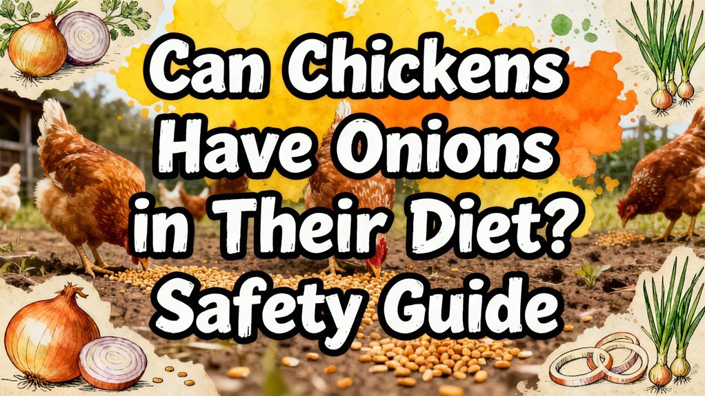 You should never feed onions to your chickens, as they contain toxic compounds like thiosulphate that cause severe hemolytic anemia by destroying red blood cells. All forms of onions – raw, cooked, or processed – pose serious health risks to your flock. Other Allium family vegetables, including garlic, leeks, and shallots, are equally dangerous. Watch for symptoms like lethargy, pale combs, and dark urine. Understanding proper nutrition and toxic foods will help protect your flock’s health.