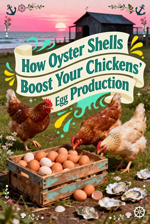 Oyster shells provide your laying hens with essential calcium carbonate that’s vital for eggshell formation, requiring 2 grams of calcium per egg. Your chickens need 4-6 times more calcium than non-laying birds, and oyster shells offer excellent bioavailability compared to synthetic alternatives. By offering free-choice access to coarse shells (1/8 to 3/8 inch), you’ll support ideal shell strength and consistent production. Understanding the science of calcium absorption and timing can maximize your flock’s laying potential.