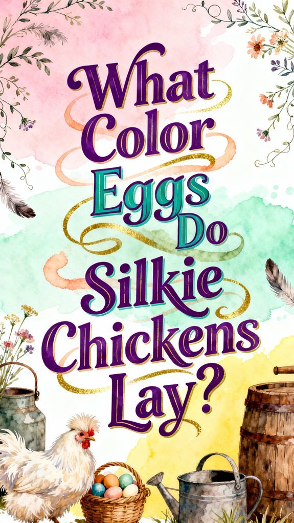 Silkie egg color isn’t determined by feather pigmentation; instead, it’s controlled by specific shell-pigment genes that operate independently from the traits you’d observe in plumage. You’ll find that protoporphyrin genes produce brown or tinted shells, while the blue-egg gene (oocyan) generates blue shells through SLCO1B3/EDAR regions. When you combine both genes through selective egg color genetics, you’ll get olive or greenish eggs as the blue pigment underlies the brown overlay. Standard Silkie flocks typically lay white or pale cream eggs without introduced egg-color genes. Interestingly, Ameraucana chickens, like Silkies, are celebrated for their unique blue egg trait; however, their egg production differs. Homemade chicken treats can also enhance the nutritional value of a chicken’s diet, contributing to healthier egg production. Incorporating nutritious food into their diet can also play a key role in the overall health of the hens, affecting egg-laying outcomes. Breeding influences greatly shape outcomes—crossing Silkies with blue-egg carriers reliably introduces blue potential, and introducing brown-layer genetics darkens shells toward tan or olive tones. Additionally, certain chicken breeds that lay blue eggs exhibit unique genetics that allow for a variety of shell colors. It’s important to note that unlike feather color variations such as Paint and Splash, egg color does not vary with these plumage patterns in Silkies. PCR testing helps you identify carrier birds and plan targeted breeding strategies.